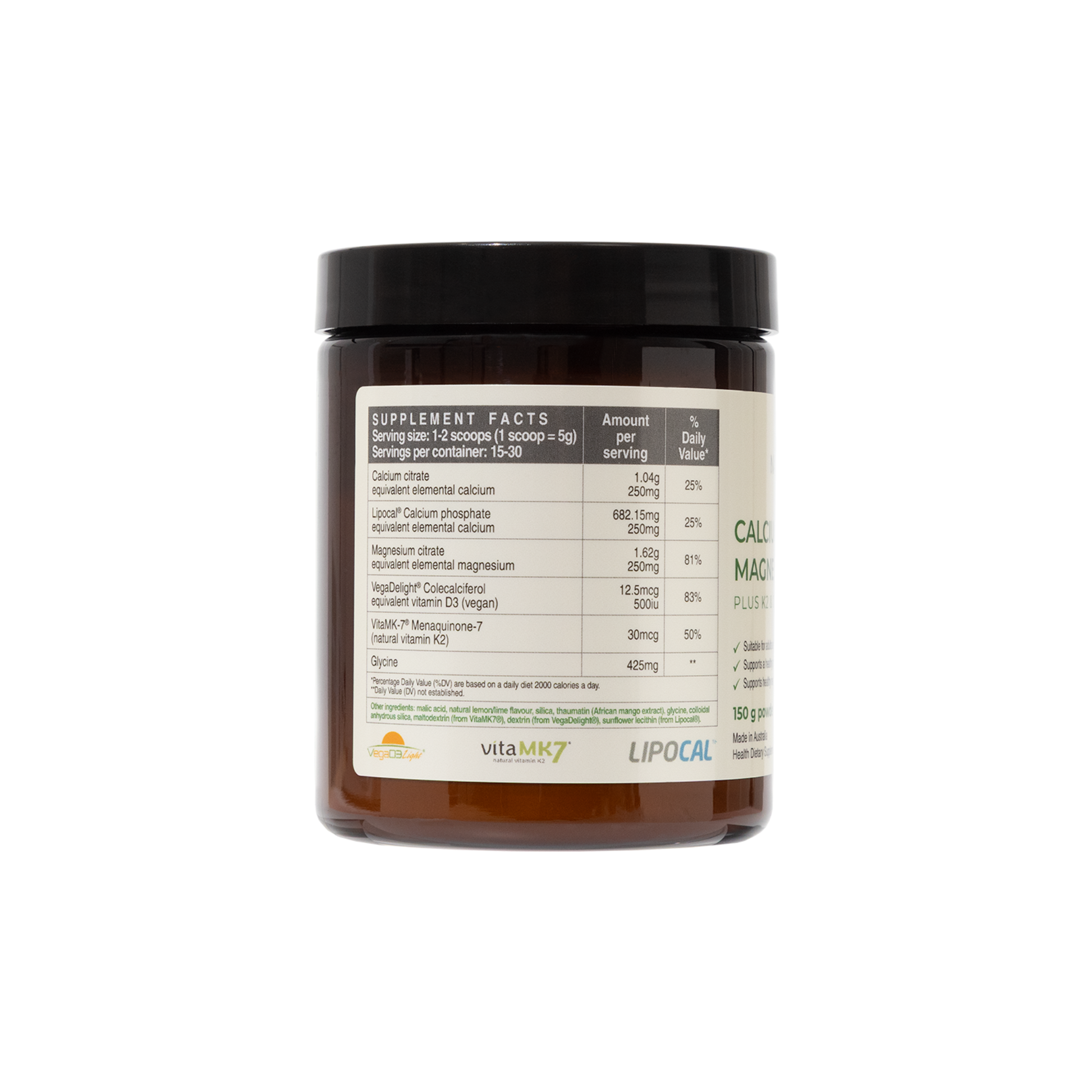 This formula has been designed to dissolve well in water with pleasant-tasting Lipocal®, well-absorbed calcium phosphate and calcium citrate, magnesium citrate, VegaDelight®, vegan-friendly vitamin D3 and natural vitamin K2 as VitaMK7.