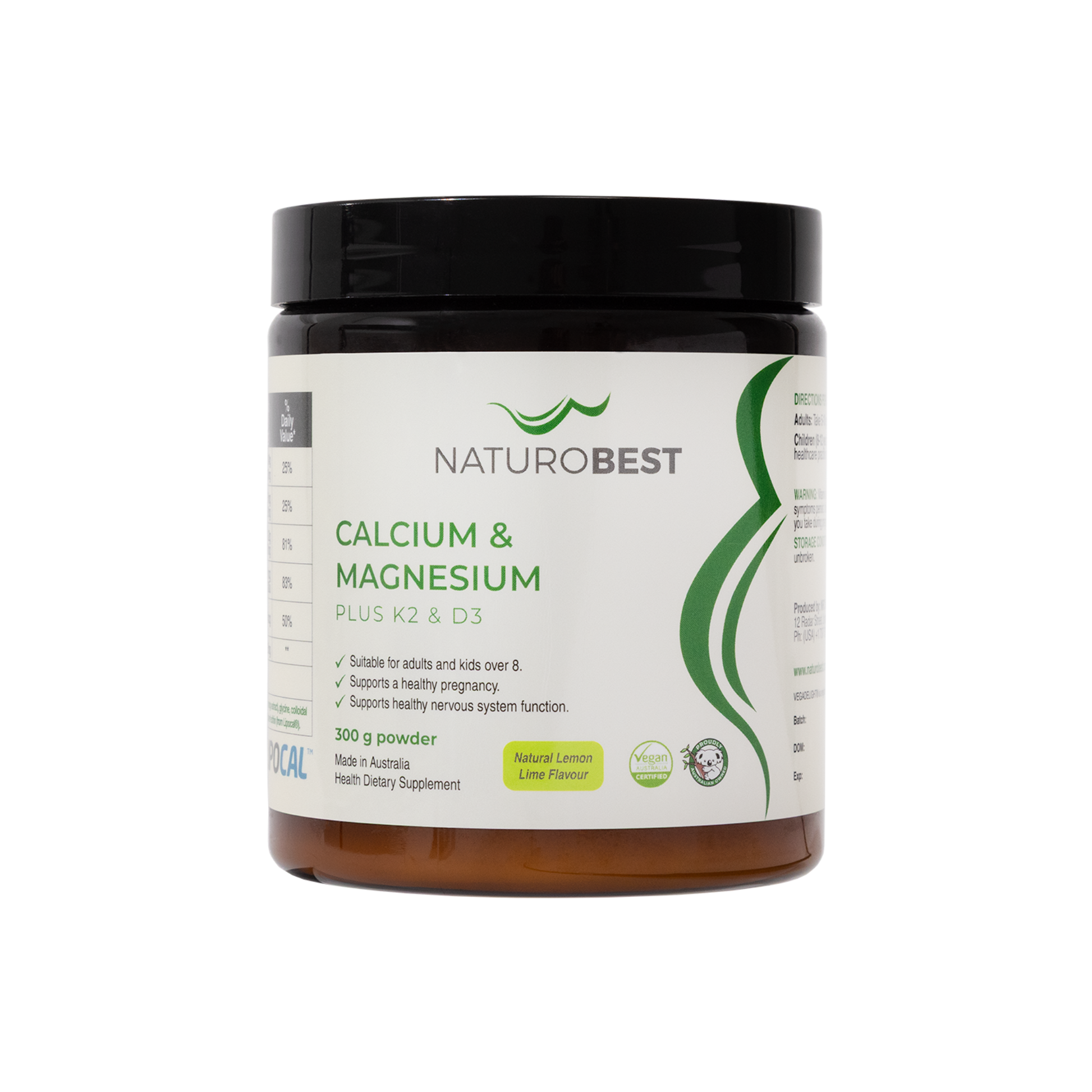 NaturoBest's high potency calcium and magnesium powder with vitamins K2 & D3 is designed for all life stages from kids over 2 years, teenagers, young adults, pregnancy, breastfeeding, menopause through to mature age adults.