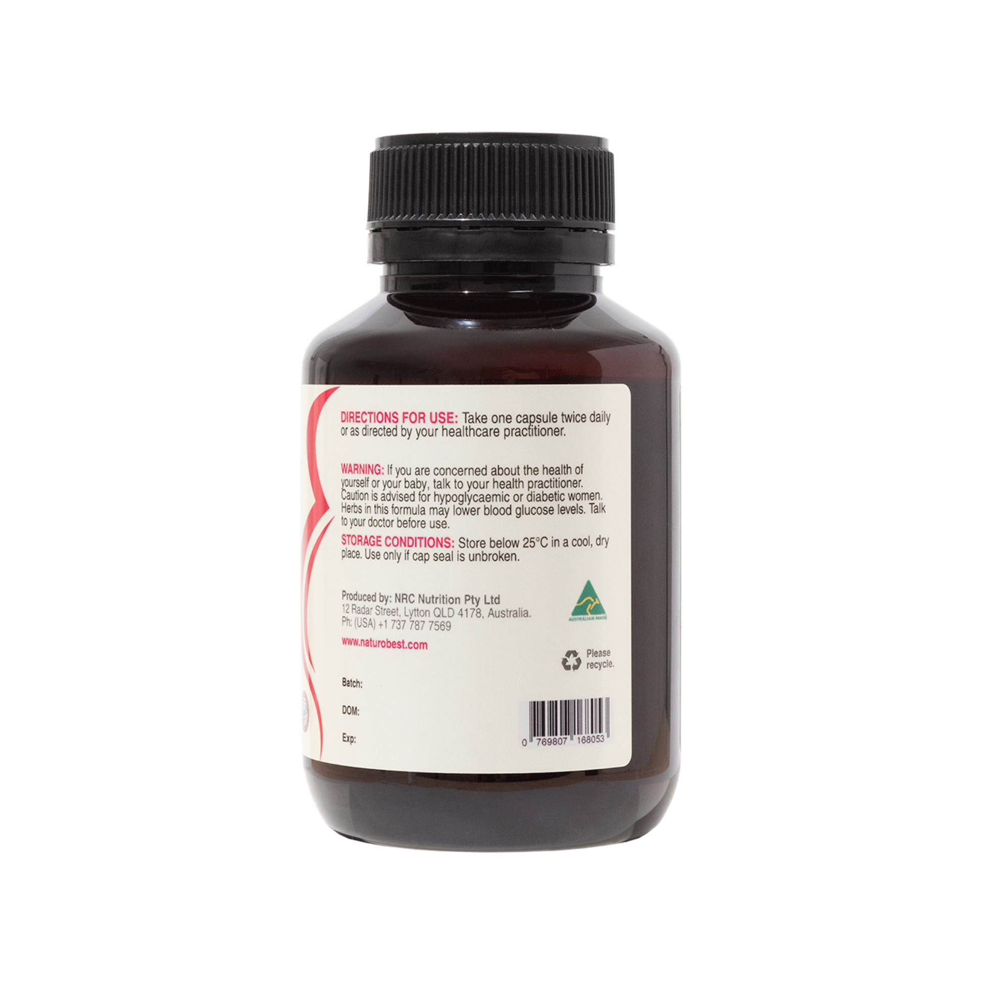 If you are concerned about the health of yourself or your baby, talk to your health practitioner. Caution is advised for hypoglycaemic or diabetic women. Herbs in this formula may lower blood glucose levels. Consult your health professional before use. Store below 25 degrees celcius in a cool, dry place. Use only if cap seal is unbroken.